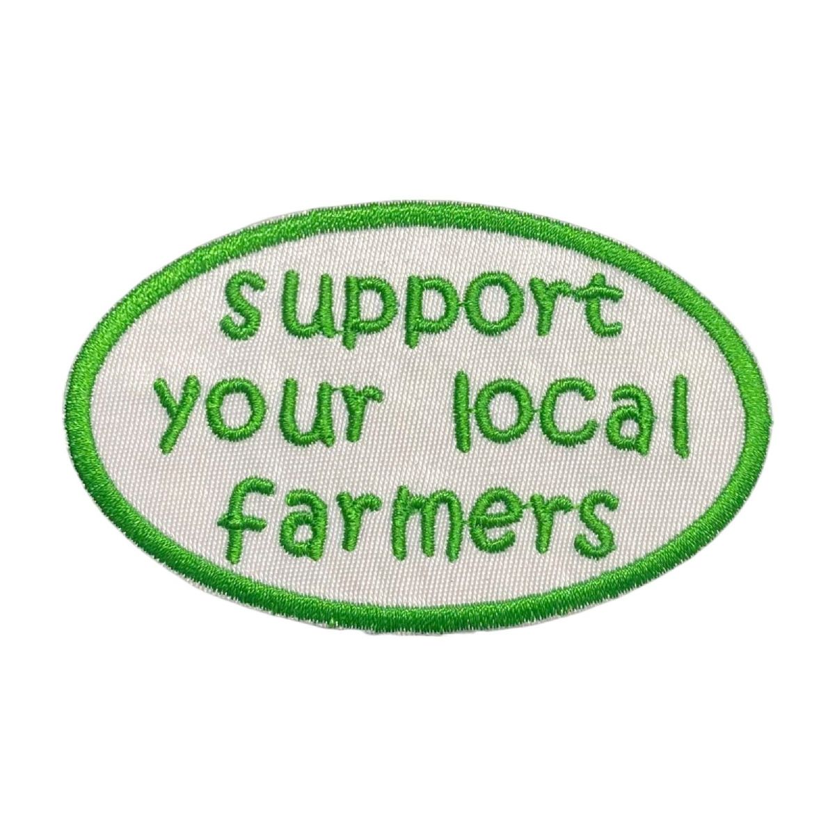 Oval patch featuring the phrase "Support Your Local Farmers,” perfect for farm, market, and agriculture-themed hats, jackets, and accessories.