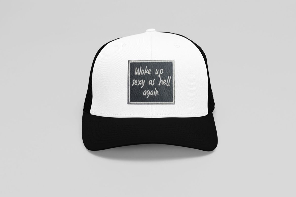 A bold, funny embroidered quote patch with confident attitude. This "Woke Up Sexy As Hell Again” patch features clean white stitching on a black background with a silver embroidered border. A popular choice for hat bar patches, trucker hat patches, jackets, backpacks, and statement DIY projects.