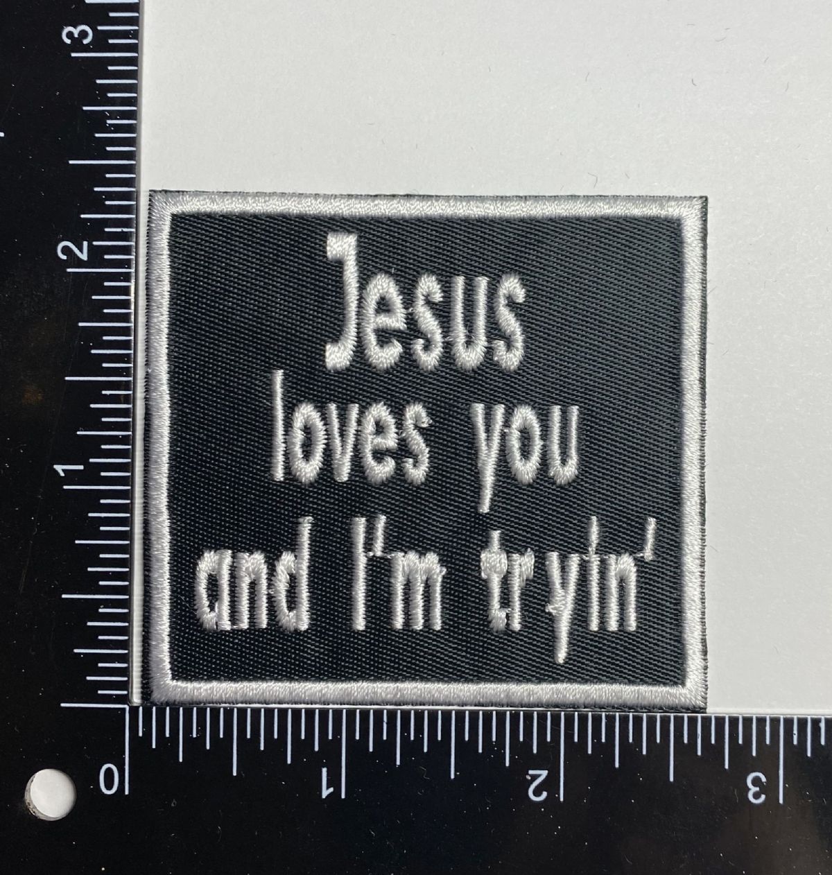 A sarcastic-but-relatable embroidered quote patch with just the right amount of humor. This "Jesus loves you and I’m trying” patch features clean white embroidery on a black background with a silver stitched border. A perfect choice for hat bar patches, trucker hat patches, jackets, backpacks, or anyone with a strong sense of faith and sarcasm.