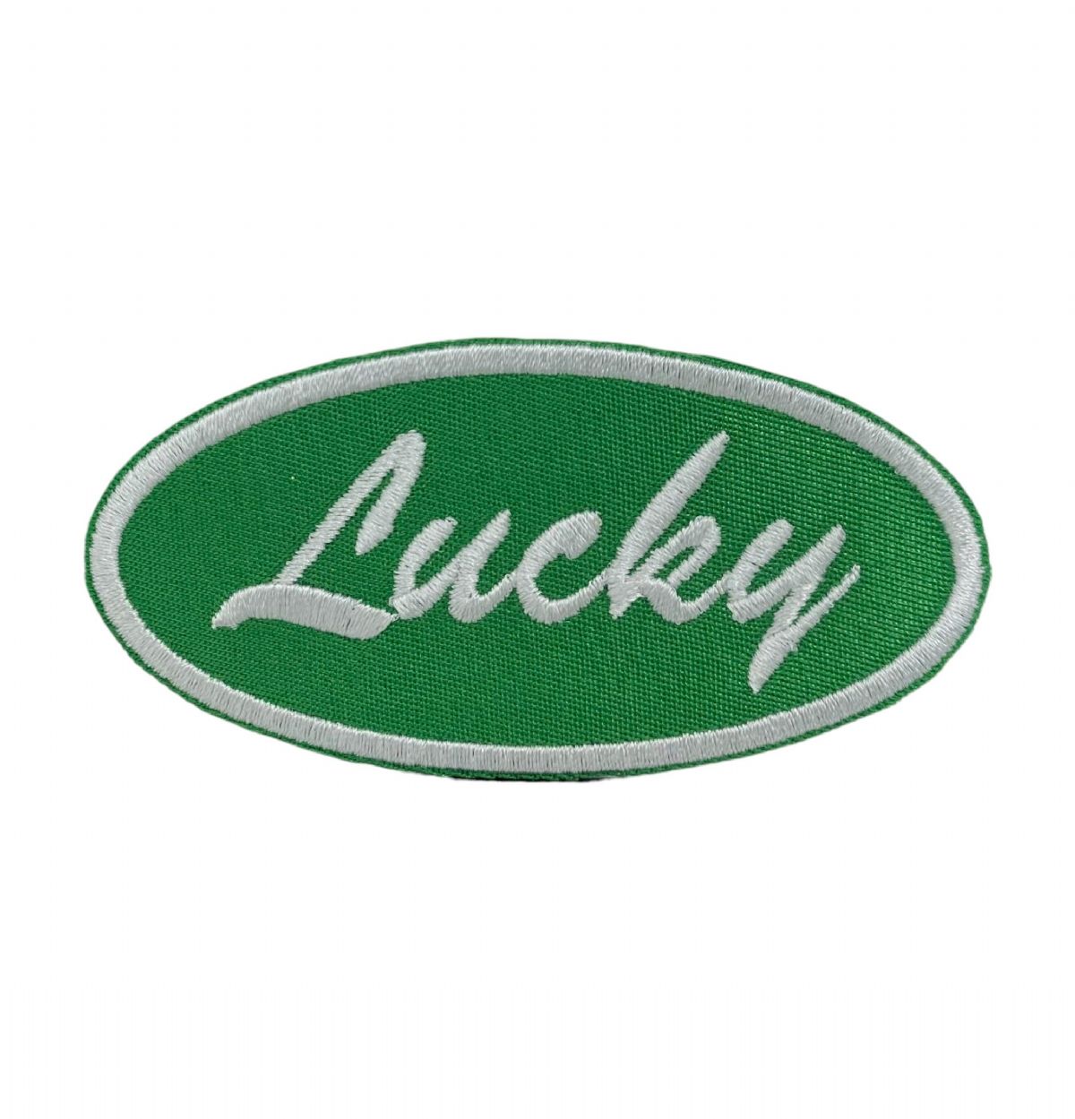 A classic embroidered oval patch featuring the word "Lucky” in clean script, perfect for adding a simple pop of color and charm to hats, jackets, backpacks, and bags. Easy to use for DIY projects, gift customization, or hat bar designs.