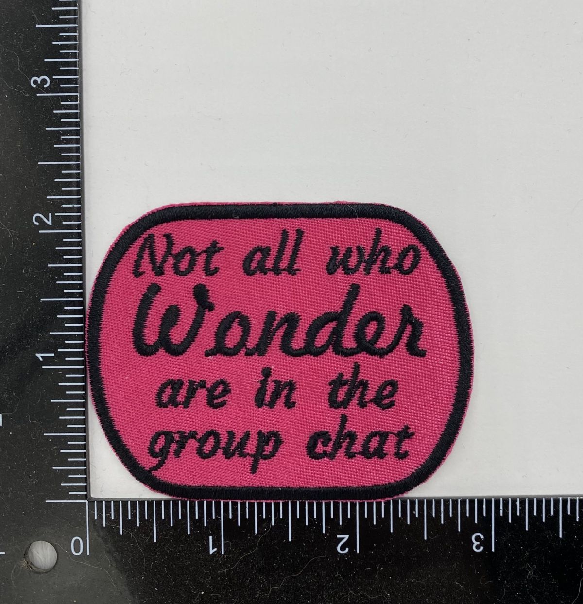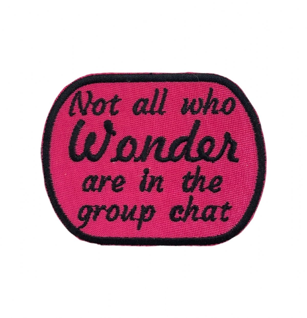 A funny embroidered patch with the phrase "Not all who wonder are in the group chat,” perfect for adding a little humor to jackets, backpacks, hats, and bags.