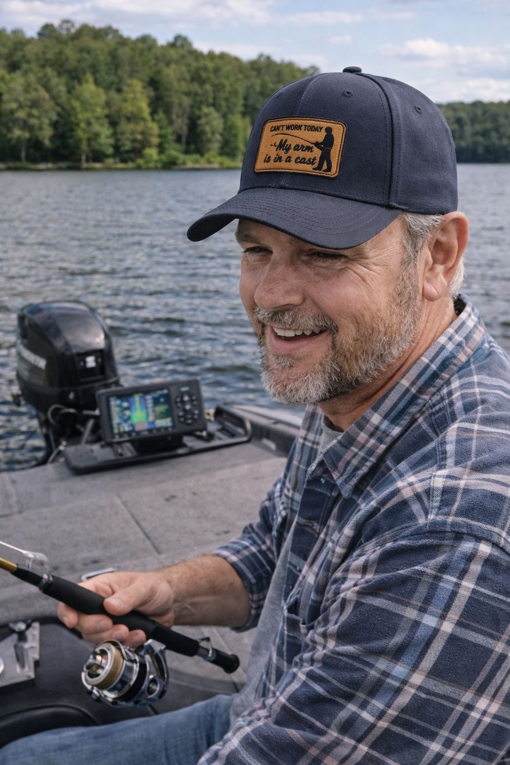 A funny fishing-themed patch featuring a cast-line design and fisherman silhouette—perfect for hats, tackle bags, backpacks, and weekend gear.