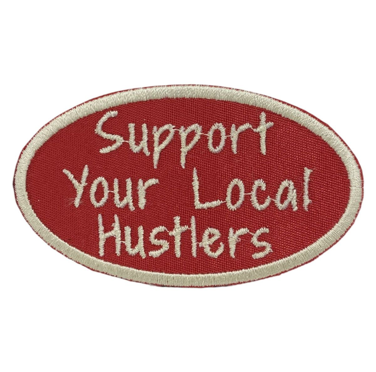 Support Your Local Hustlers, red and cream, embroidered, iron on patch.