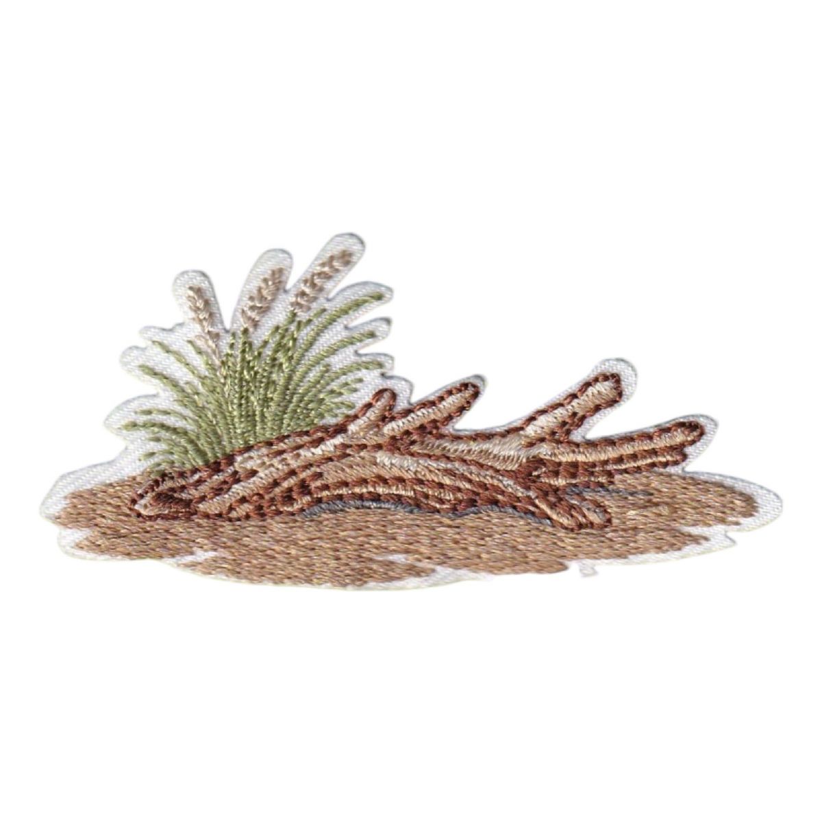 Driftwood on beach with sand and sea grass, embroidered iron on patch.