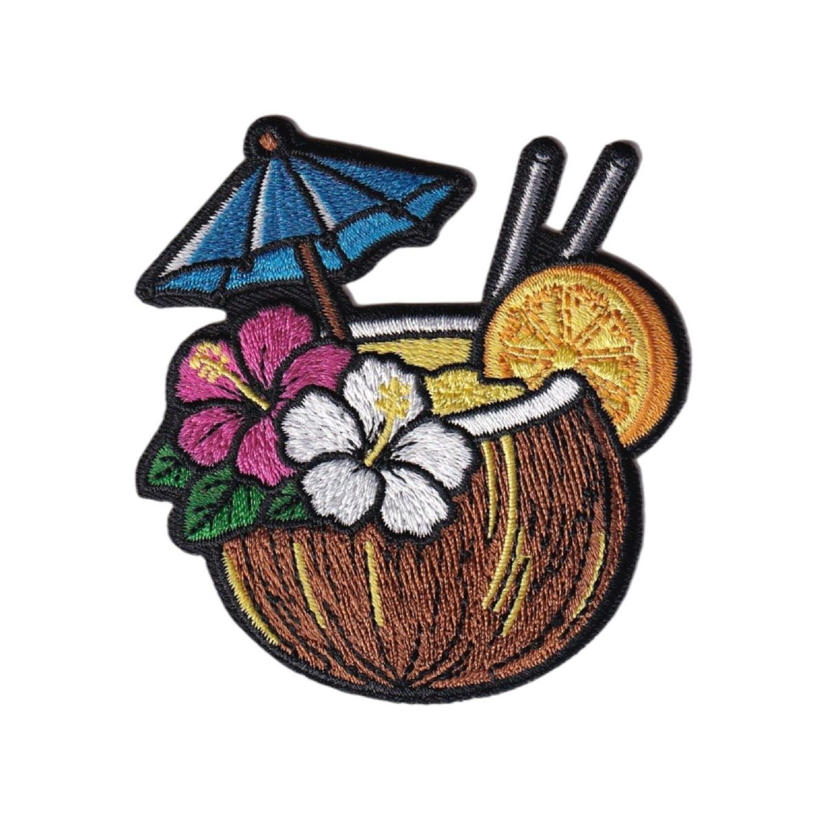 Tropical coconut cocktail with umbrella and hibiscus flowers, embroidered iron on patch.