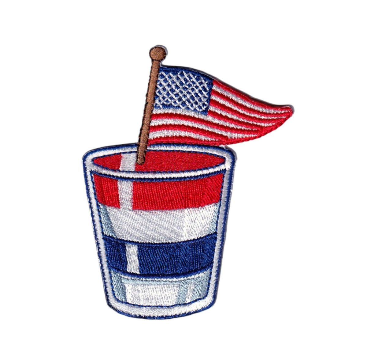 Patriotic red, white, and blue shot glass with US flag, embroidered iron on patch.
