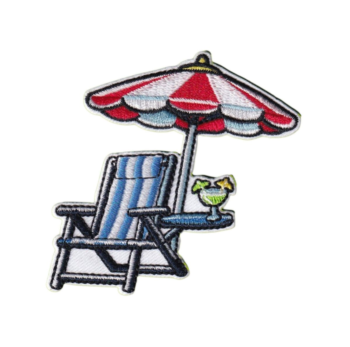 Blue striped beach chair with a red striped umbrella and a margarita, embroidered iron on patch.